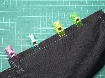次に本体を作ります。内布無しなので、上部の口の周りがほつれないように、二つ折りにします。
