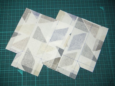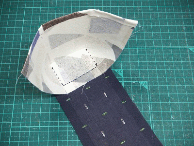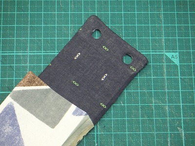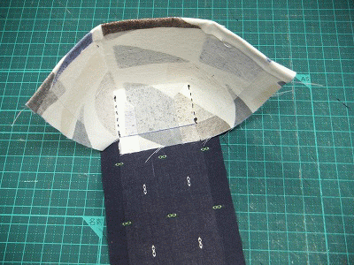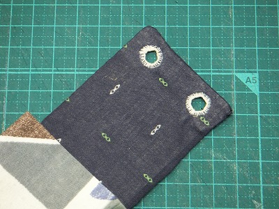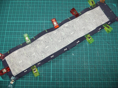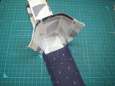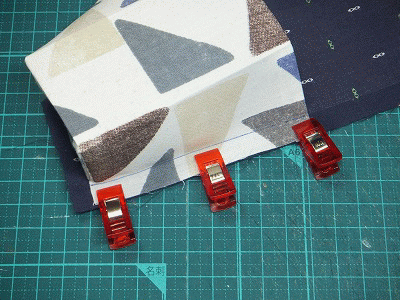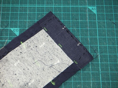 ポケットを畳んでおいて、その上に、本体の裏面の生地を中表に重ねて縫います。このとき、矢印の部分は返し口として残します。