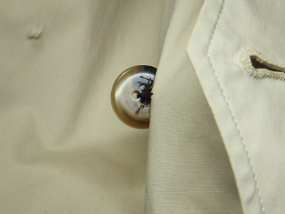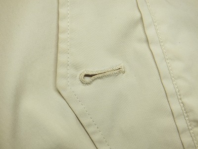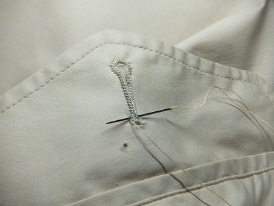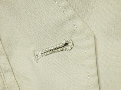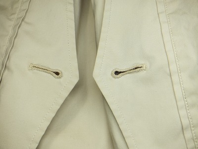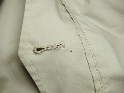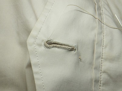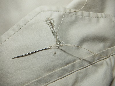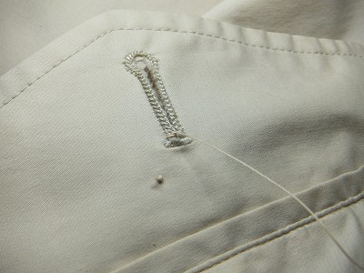 よくみると、このボタン穴かがりはミシンで縫った物ですね。結構な値段で買ったのですが、これでは見栄えがよくありませんから、手縫いで縫い直します。