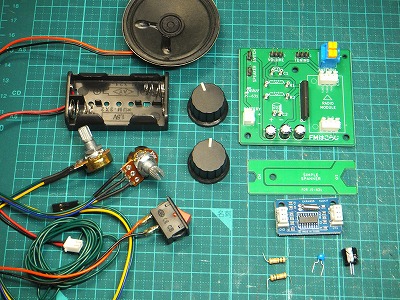 パーツを並べてみました。真空管もトランジスタもありません。受信部とスピーカーを駆動するアンプ部はICになっていますし。それらは既に基盤に実装されています。自分で組み立てる部分はほぼ無いくらいです。