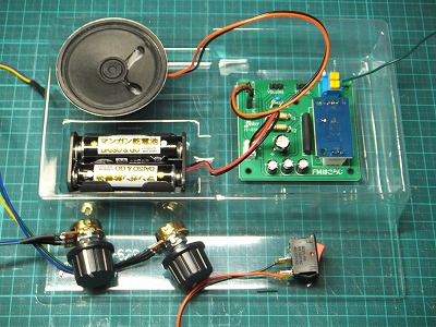 はこらじとして組み立てるため、一旦可変抵抗器二個と電源スイッチをはずして、透明ケースに入れました。通常は基盤や電池ボックスなどはビス留めするところですが、透明ケースがゆるく固定するという役割を果たします。
