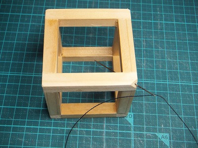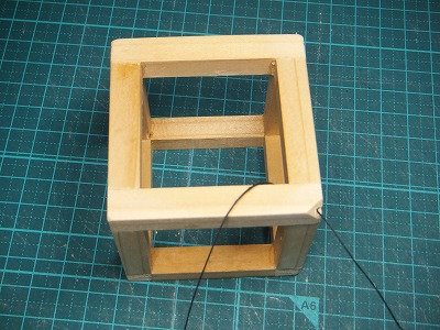 立方体の下部の孔に針を使って糸を通します。